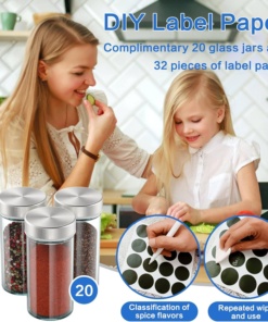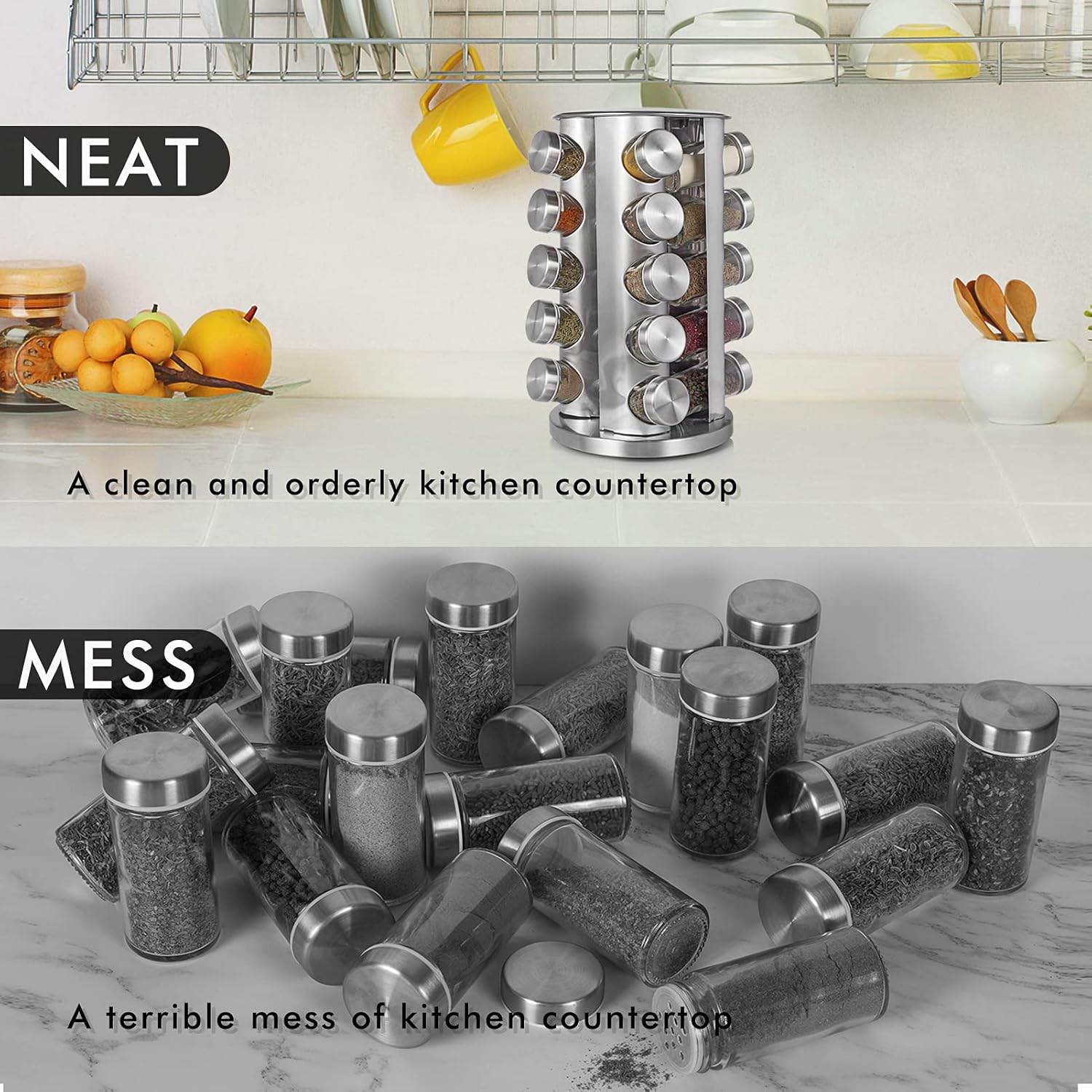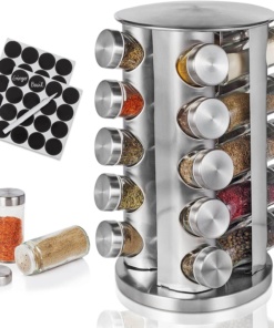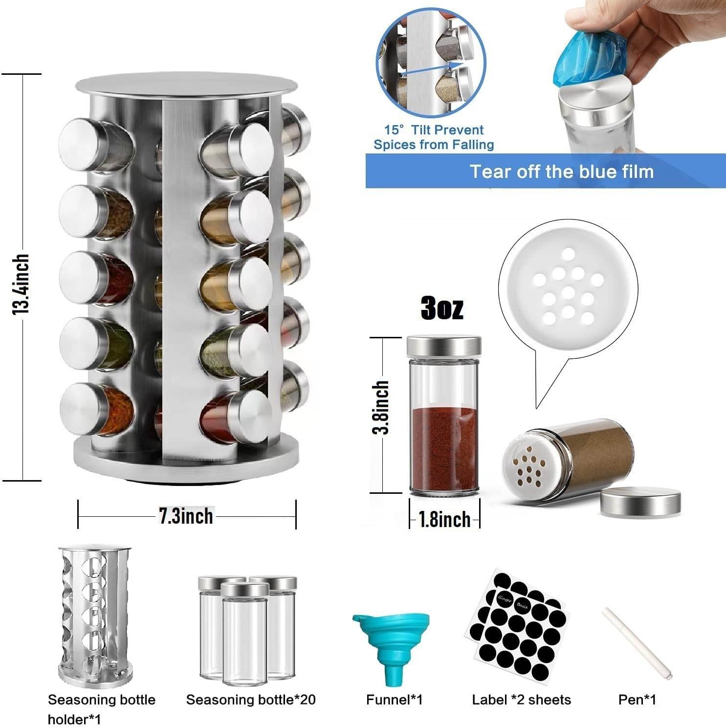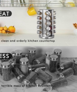 ⭐Ideálne skladovanie korenia: Polička na korenie pojme 20 pohárov s korením. Nádoba na korenie je vybavená emulgačným sitkom, takže môžete ľahko kontrolovať množstvo rôznych korenín. Vďaka dobrej tesnosti a vysokej rýchlosti zvárania je možné zachovať arómu a vôňu korenia po dlhú dobu a zároveň majú dostatok miesta. (Upozornenie: Poháre na korenie neobsahujú korenie. )