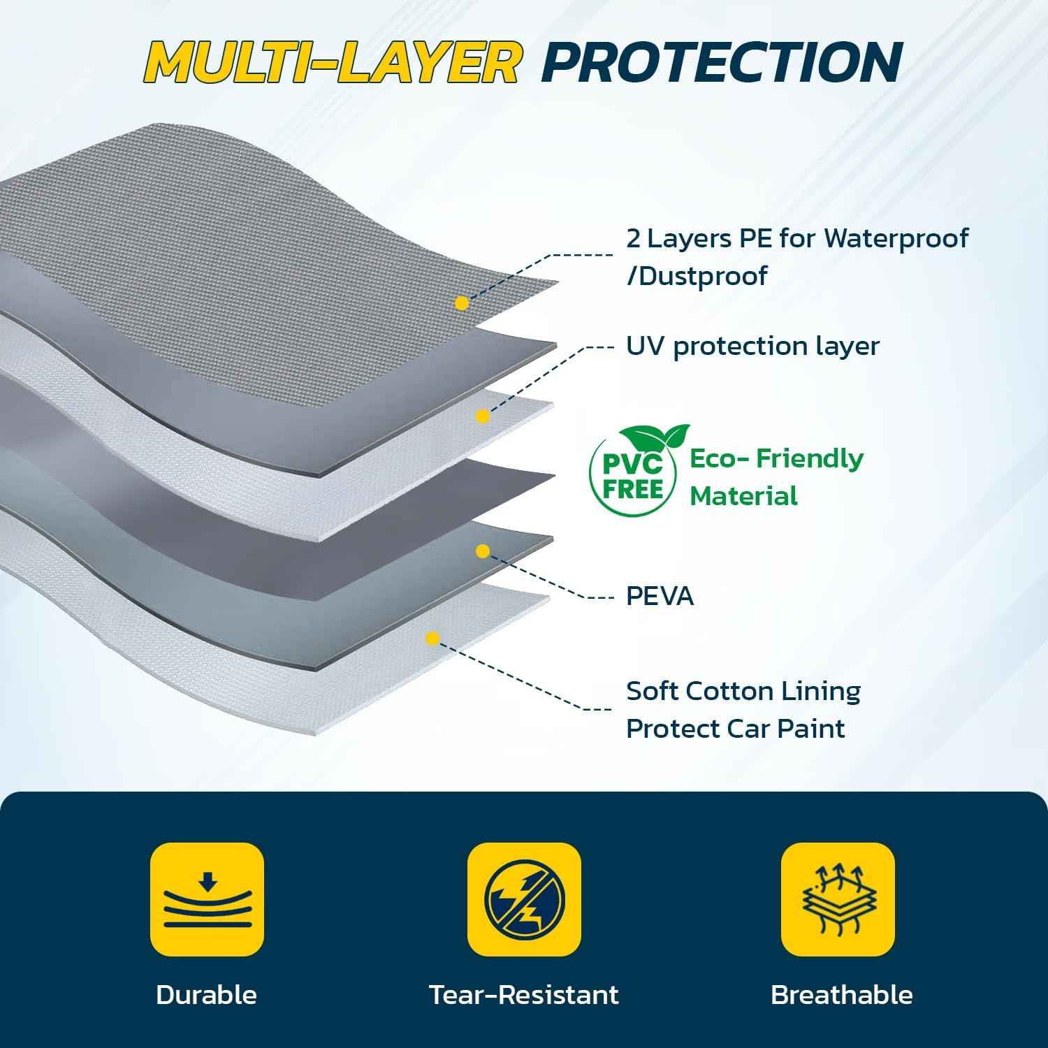 Poťah je vyrobený z kvalitnej PEVA, ktorá je odolná proti roztrhnutiu. Silné švy použité pri výrobe robia výrobok ešte odolnejším. Toto riešenie znamená, že sa nemusíte obávať sĺz spôsobených napríklad silným vetrom.